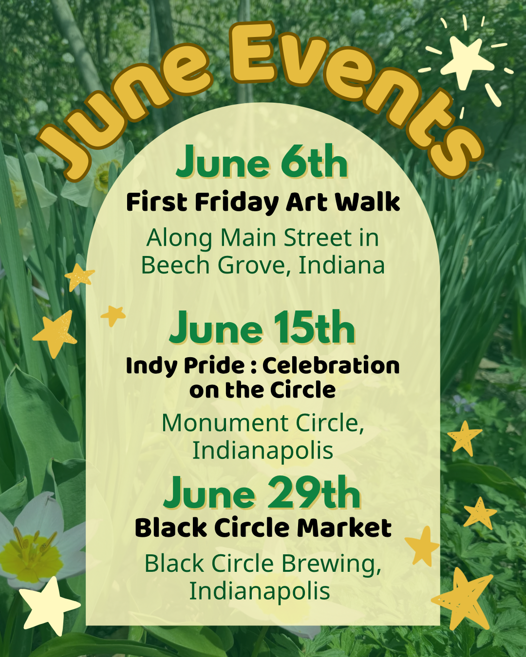 Jun 29 Black Circle Market Sunday, June 29, 2025 12:00 PM 5:00 PM Google Calendar ICS Located at Black Circle Brewing, Indianapolis View Event → Jun 15 Indy Pride: Celebration on the Circle Sunday, June 15, 2025 12:00 PM 5:00 PM Google Calendar ICS Located at Monument Circle in Indianapolis View Event → Jun 6 First Friday Art Walk Friday, June 6, 2025 5:30 PM 9:00 PM Google Calendar ICS Located Along Main Street in Beech Grove, Indiana View Event →